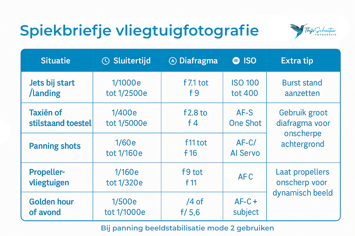 4.9 Instellingen overzicht: spiekbriefje voor vliegtuigfotografie